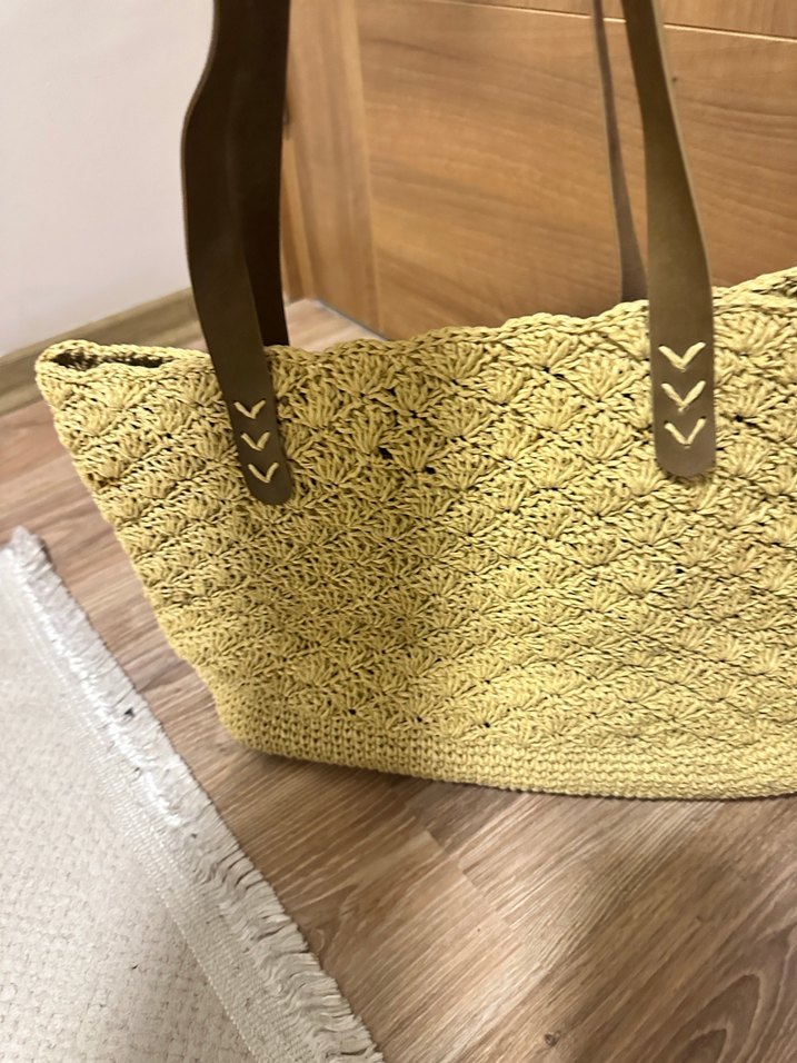 Bej renkli, dantel detaylı, parlak dokulu örgü bohem tarzda kadın çantası. Dayanıklı kahverengi saplara sahiptir, günlük kullanıma uygundur.