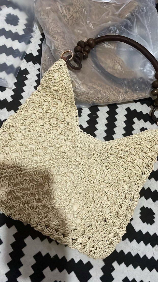 Nakışlı dantel detaylı, örgü bohem tarzda bej kadın çanta, ahşap saplı, günlük kullanıma uygun.