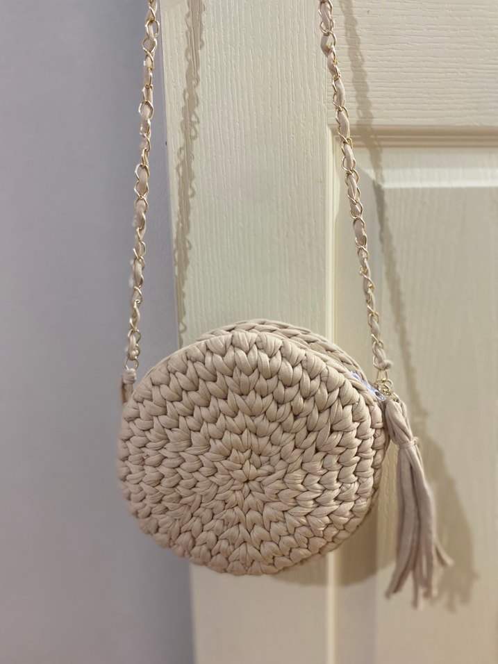 Nakışlı detaylara ve püsküle sahip bej çapraz çanta, zincir askılıdır. Günlük kullanım için bohem tarzda bir çantadır. İçi astarlı