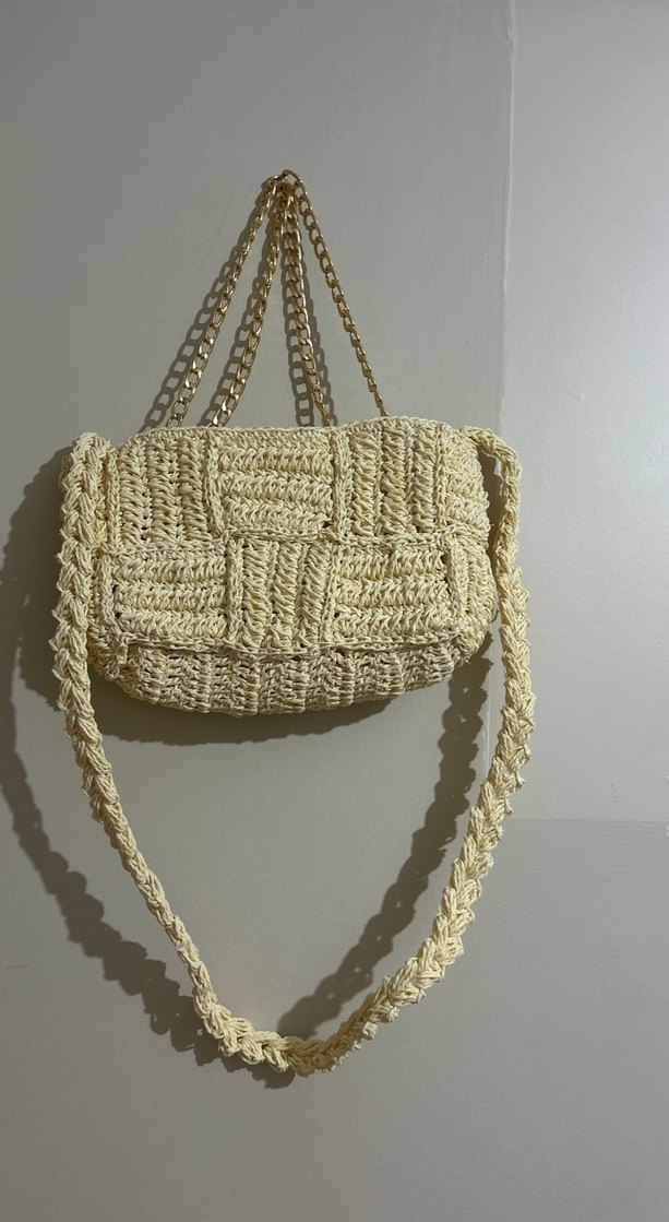 Bej renkte, örgü dokulu, bohem tarzında kadın çantası. Örgülü askısı ve zincir detayı bulunur. Günlük kullanıma uygundur. Paslanmaz zincir kullanılmıştır görseldeki ürün hazırdır fakat istenilen boyut ve renkte örülüp gönderilebilir