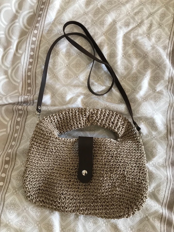 Bej renkli, kahverengi askılı ve düğmeli örgü kadın çantası, günlük kullanım için bohem ve rahat bir stile sahiptir. Sorunsuz içine telefon cüzdan sığar ama küçük hazneli kullanıldı ama sorunsuz