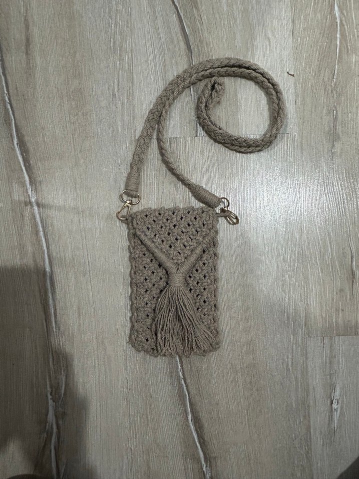 Bej örgü çapraz çanta, nakışlı detayları ve püskülüyle bohem tarzını yansıtıyor. Günlük kullanıma uygun, örgülü askısı rahat taşıma sağlar.