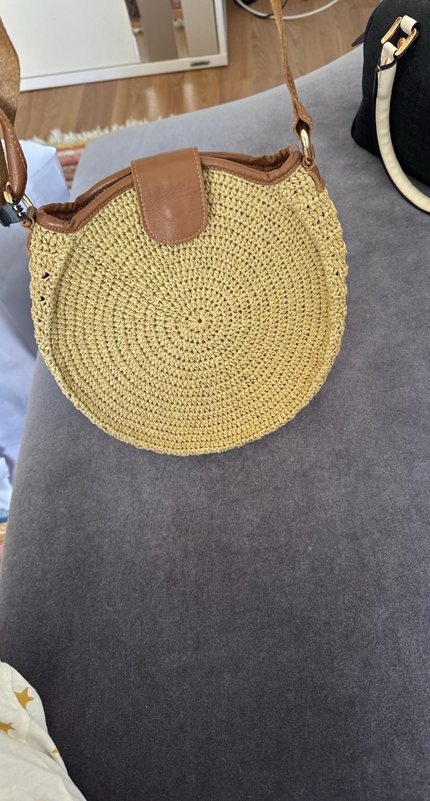 Açık bej renkli, kemerli detaylı örgü çapraz çanta, bohem tarzıyla günlük kullanıma uygundur.