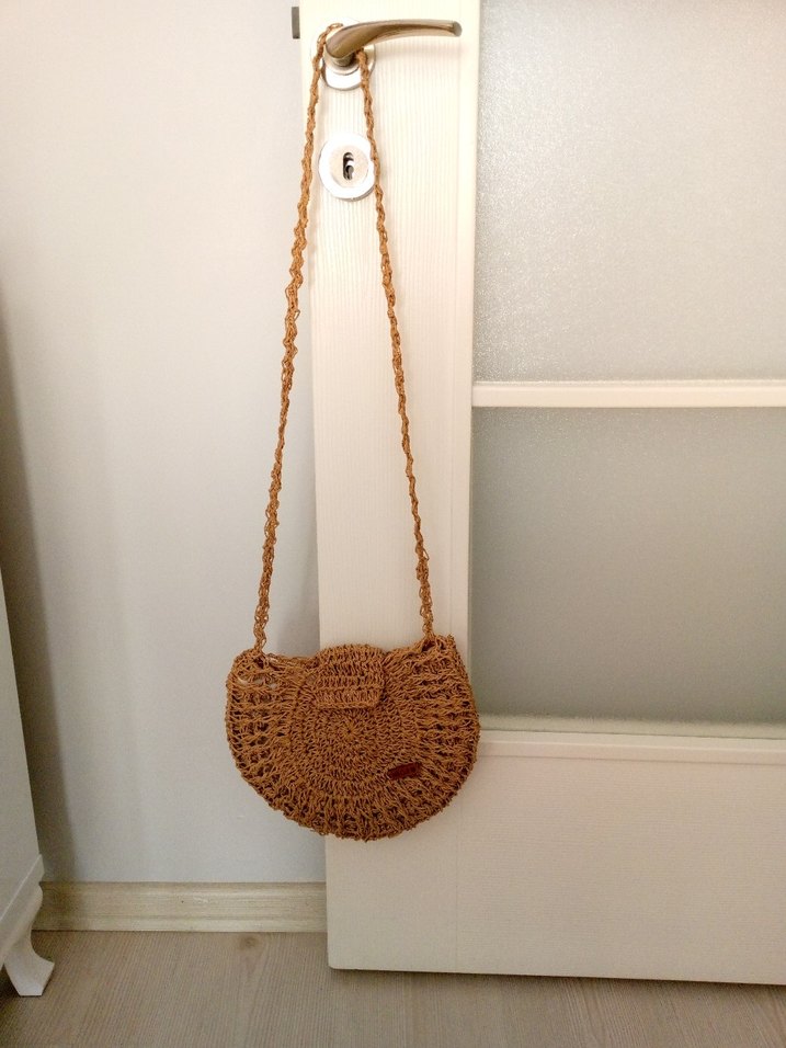 Parlak görünümlü bej örgü çapraz çanta, bohem tarzda ve desensizdir. Günlük kullanım için uygundur. el emeği #çanta#kağıt ip#örgü