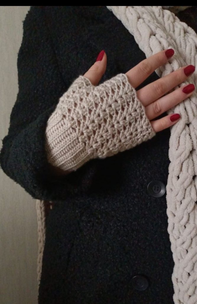 Bej renkli, bohem tarzda kadın örgü eldiveni. Sıcak ve dokulu örme kumaştan yapılmıştır. Vintage görünüm için uygun.
