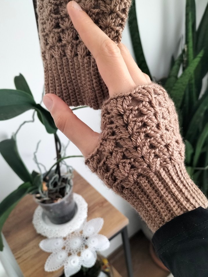 kahve renkli, örgü yapıda bohem tarz kadın eldivenleri. Parmak uçları açık, sıcak tutan dokulu tasarım. eldiven uzunluğu dilediğiniz şekilde yapılır. kişiye özel tasarım
