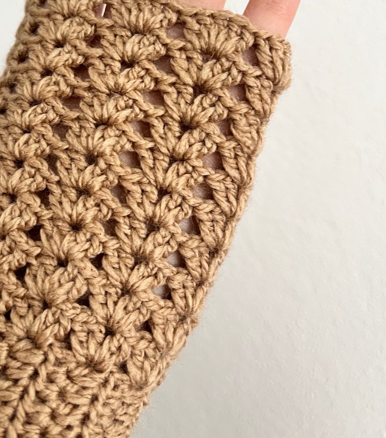 Bej renkli, hafif ve hava alan örgü desene sahip, bohem tarzda kadın eldiveni. Retro ve hippie görünüm için uygun.