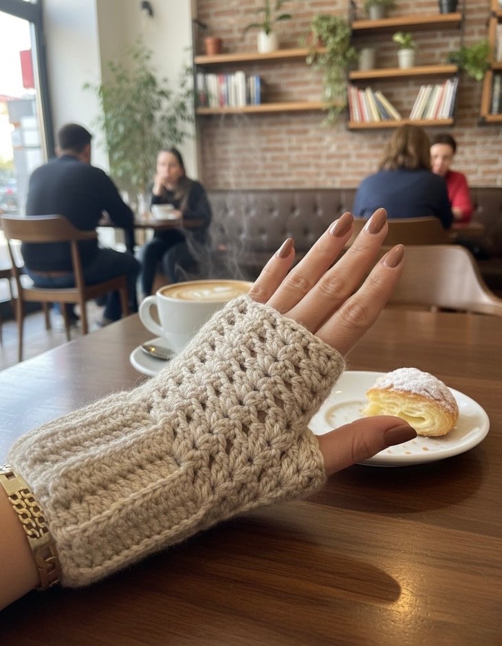 Bej renkte, bohem tarzda, örgü dokulu ve parmakları açık kadın eldivenidir. Rahat ve sıcak tutar.