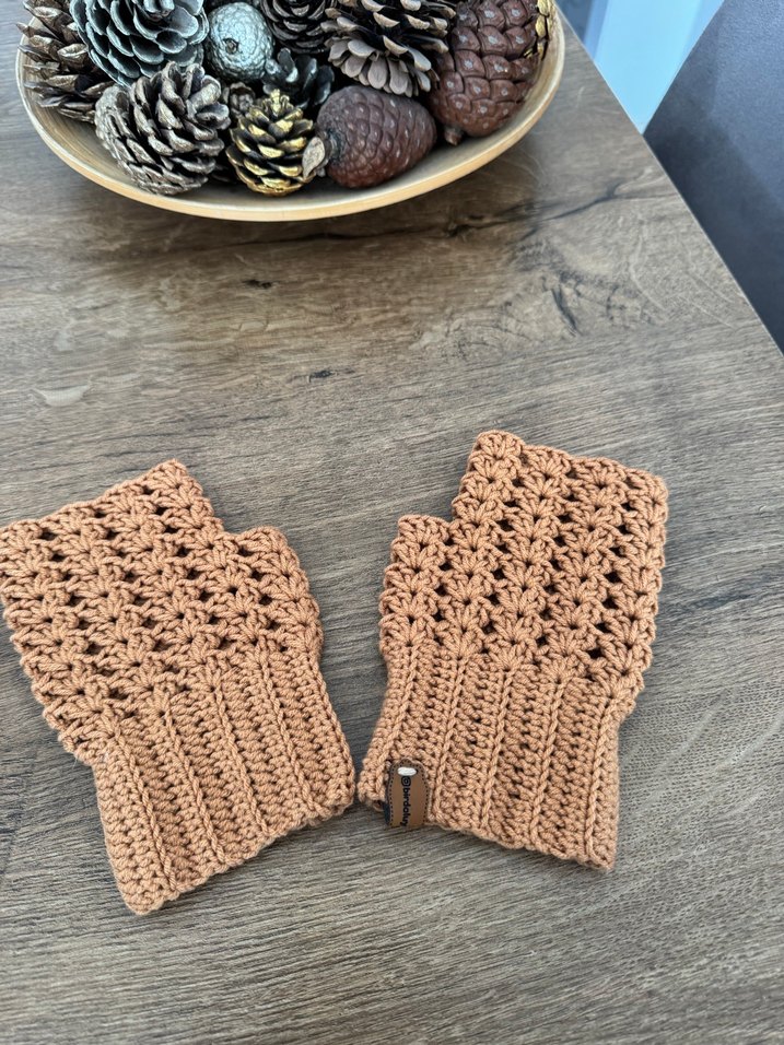 Bej renkli, örgü dokulu kadın eldiveni. Sıcak tutan, bohem tarzda rahat bir modeldir.