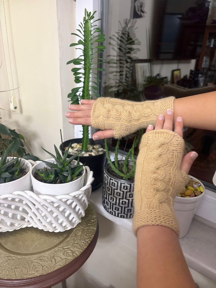Hafif bej renkte, örgü dokulu, bohem tarzda kadın eldiveni. Rahat ve retro görünümüyle hippie stiline uygun.