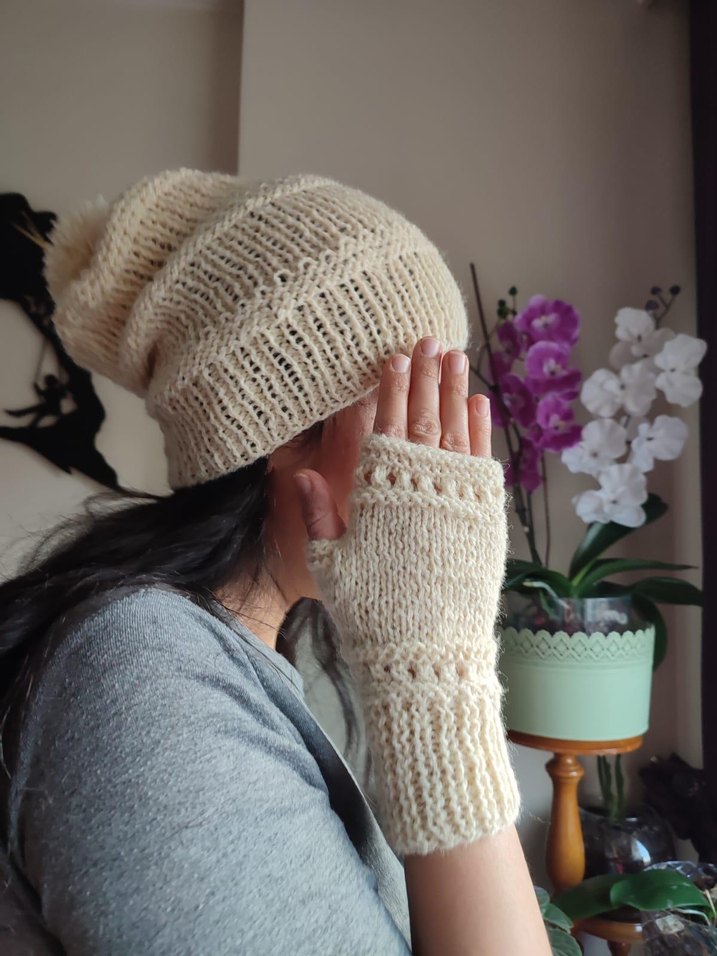 Bej renkli, hafif örgü dokusuyla bohem tarzda kadın eldiveni, retro ve hippie görünüm için uygundur.