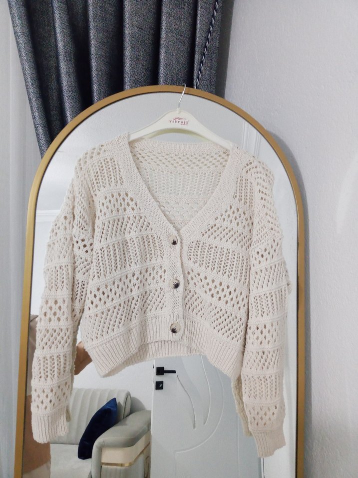 Bej renkli, V yakalı, uzun kollu, gevşek kesim örgü bohem kadın hırka. Günlük kullanıma uygun, midi boyda, desensiz model.