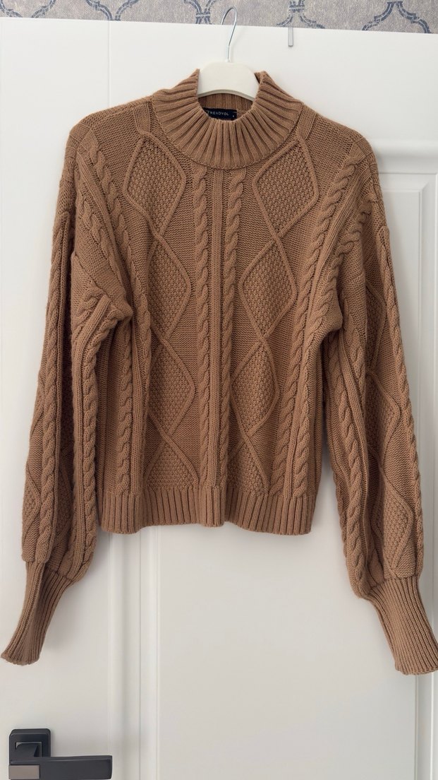 Bej renkli, yüksek yakalı ve uzun kollu örgü kazak. Rahat kesimi ve bohem tarzıyla günlük kullanıma uygun.