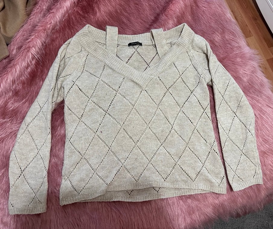 Bej renkli, yakası hem askılı hem omuz modelli ve uzun kollu örgü kazak. Gevşek ve bohem tarzıyla günlük kullanıma uygundur. Elmas desenli örgü dokusu vardır.