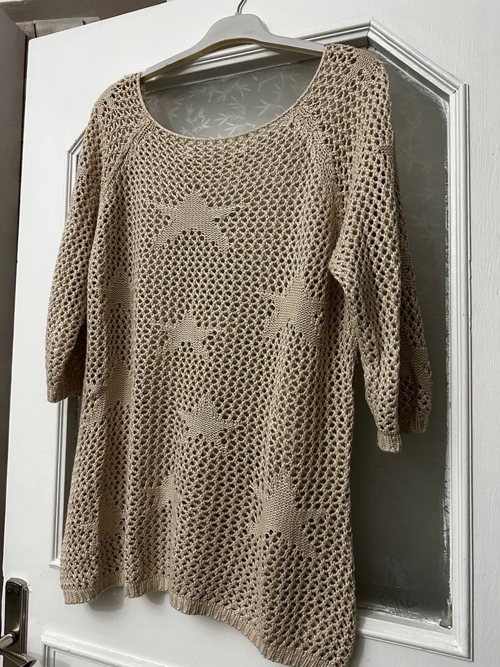 Bej renkli, uzun kollu, bol kesim örgü kadın kazak. Bohem tarzı ve yuvarlak yaka ile günlük kullanıma uygun.