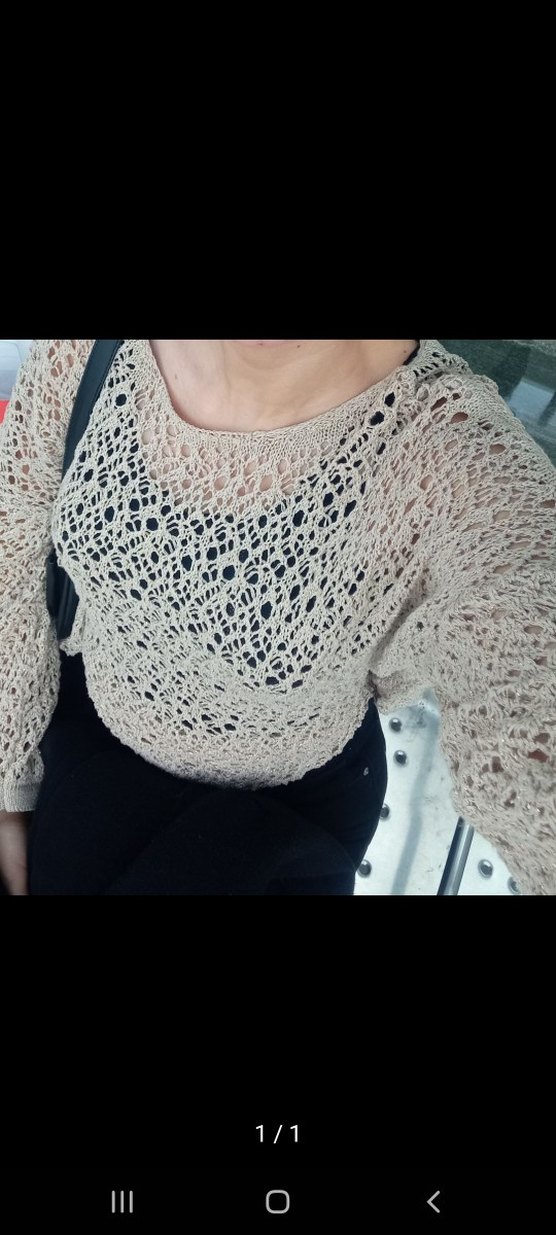 Bej renkli, örgü dokulu, bol kesim ve yuvarlak yaka kadın kazak. Kısa boylu ve askılı kollu, rahat ve bohem tarzda bir parça.