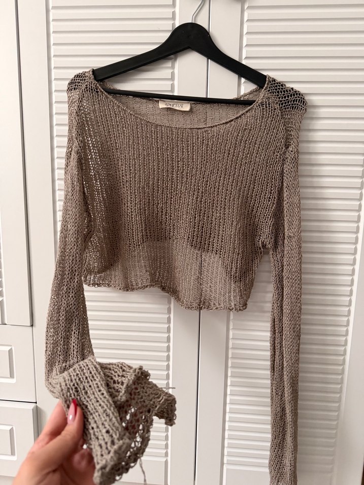 Bej renkli, örgü kumaştan, bol kesim ve uzun kollu, yuvarlak yaka bohem tarzı kadın kazak. Rahat ve gündelik kullanıma uygundur.