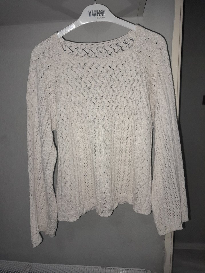 Bej renkli, uzun kollu ve yuvarlak yakalı örgü kadın kazak, bol kesimi ve bohem tarzıyla rahat bir kullanım sunar.