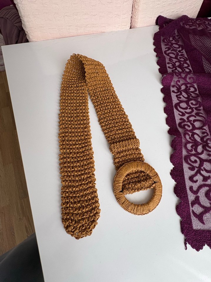 Bej örgü kumaştan yapılmış, yuvarlak tokalı bohem tarzında, parlak ve rahat bir görünüm sunan kadın kemeri.