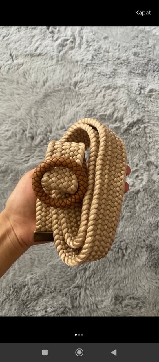 Ahşap tokalı, bej örgü kumaştan yapılmış bohem ve rahat tarzda kadın kemeri. Retro ve hippie görünüm için uygundur.