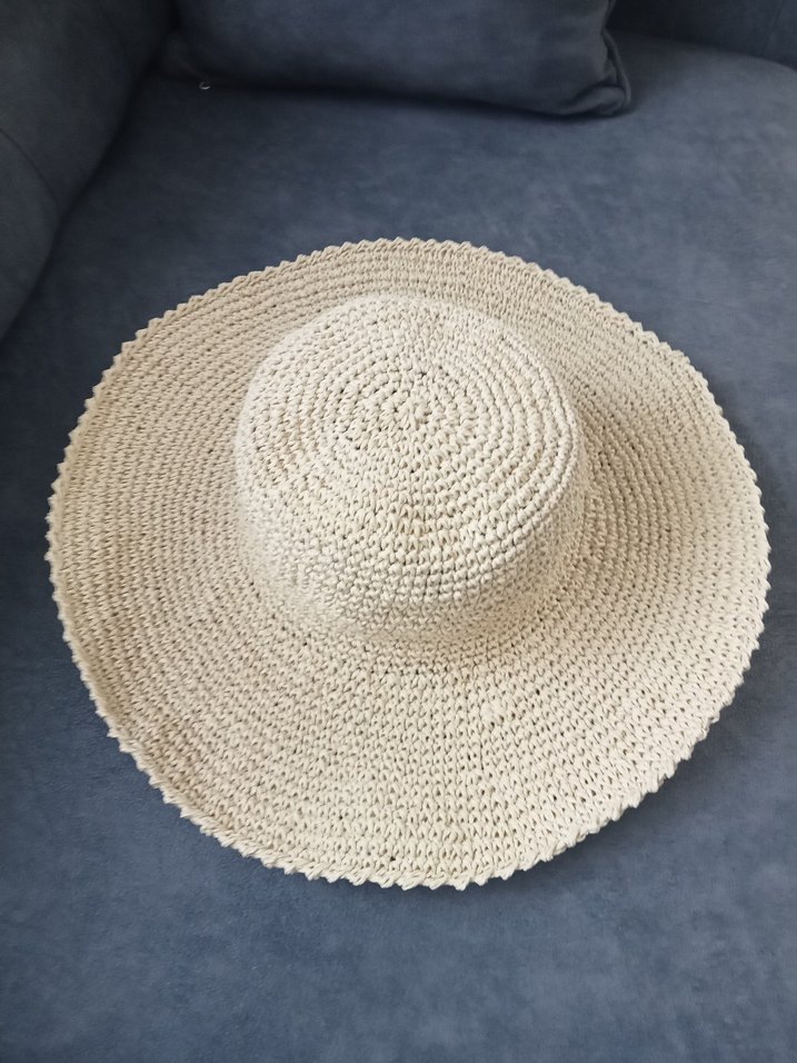 Kadınlar için açık bej renkli, örgü dokuma geniş kenarlı bohem şapka. Retro ve hippie tarzına uygun.el örgüsü pilaj sapkasi marka temsilidir