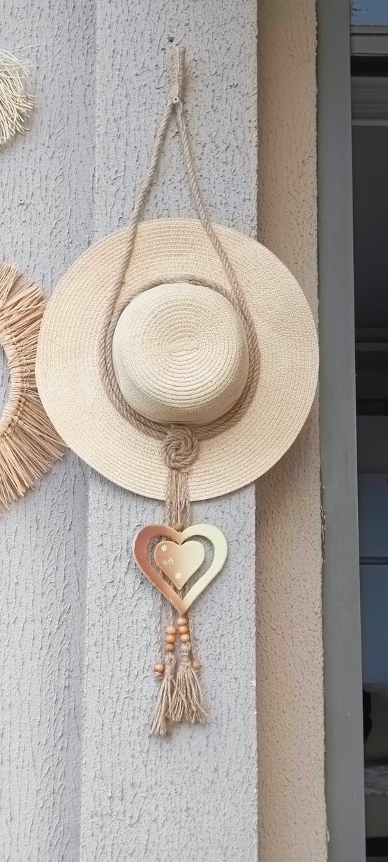 Bej renkli, örgü dokulu bohem tarzda kadın şapkası, püskül ve kalp süslemelidir.