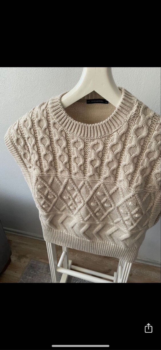 Bej renkli, örgü bohem tarzda, kısa ve bol kesim kadın süveter. Bisiklet yaka ve kolsuz tasarımıyla günlük kullanıma uygundur.