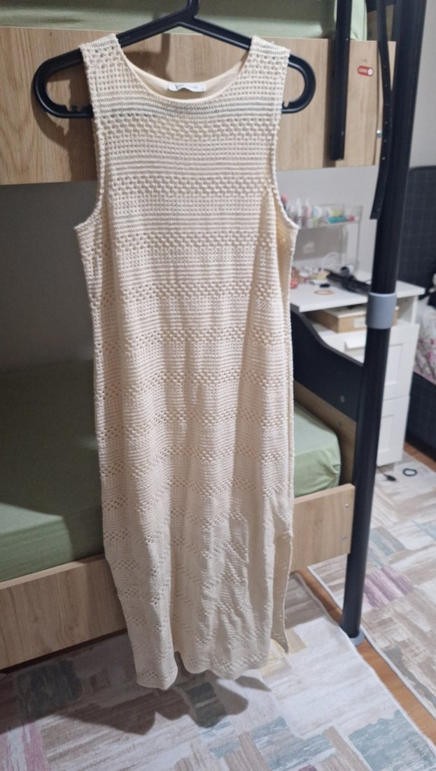 Bej renkli, örgü kumaştan yapılmış, kolsuz ve yuvarlak yakalı uzun elbise. Rahat kesimiyle bohem tarzda, günlük kullanım için uygun.