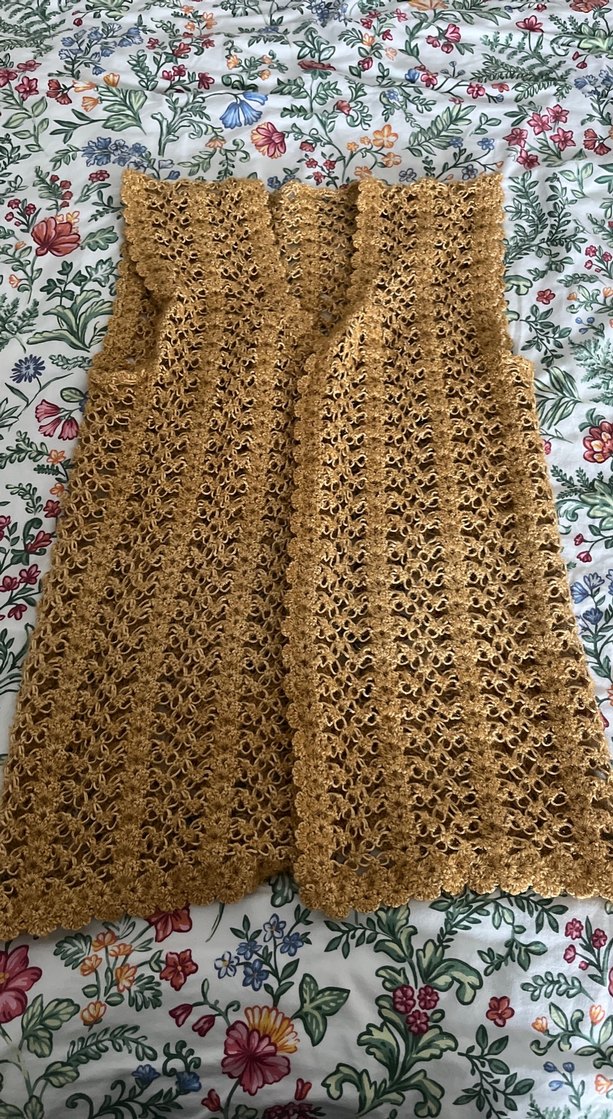 Bej renkli, parlak dokulu, gevşek kesim ve kayık yaka, kolsuz örgü yelek. Günlük kullanıma uygun bohem tarzda.