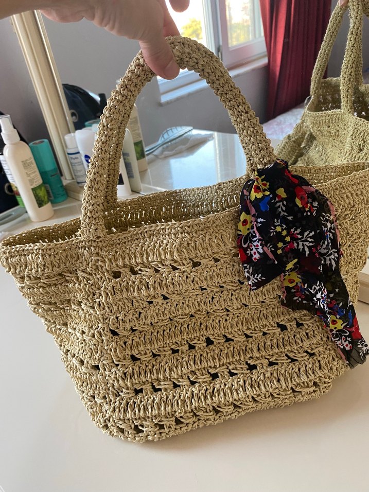 Bej renkli, dantel detaylı örgü kol çantası. Renkli fular ile bohem tarzda, günlük kullanıma uygun.
