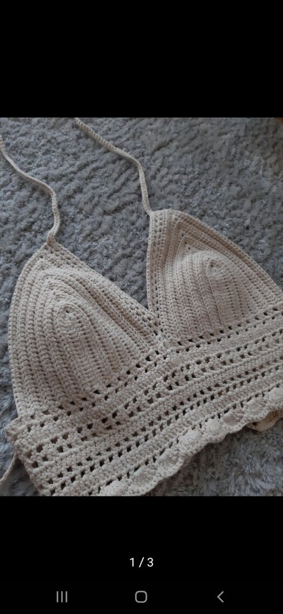 Bej renkli, V yakalı ve askılı örgü bustiyer. Bol kesim ve mini boyda, bohem tarz için uygun. hiç kullanmadım