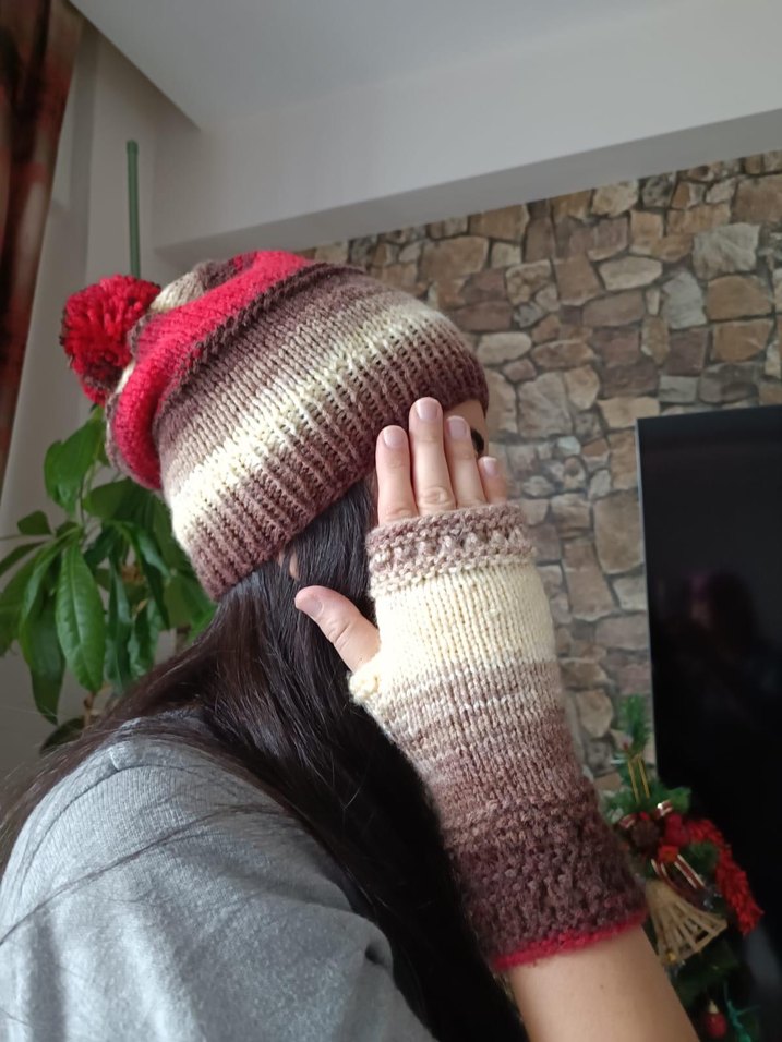 Hafif bej renkli, örgü ve parmakları açık bohem tarzda eldiven. Rahat ve retro görünüm sağlar.