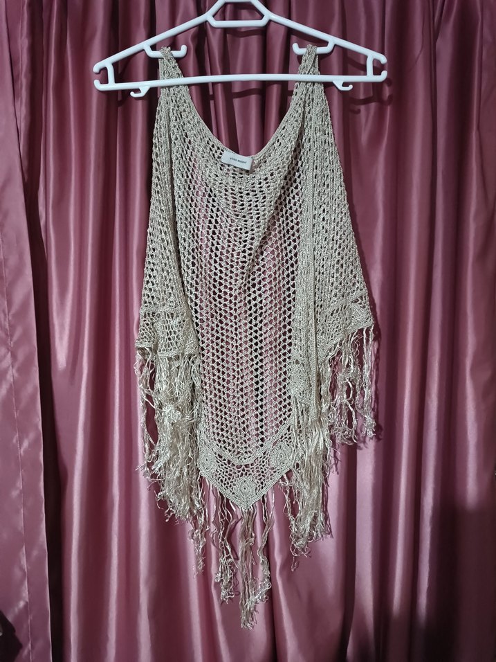 Püsküllü, açık örgü desenli bej renkli bohem tarzda örgü şal. Retro ve hippie tarzlara uygun bir aksesuar.