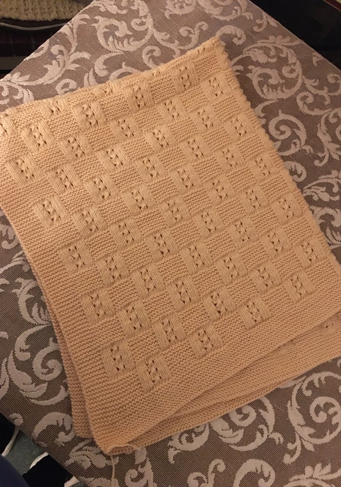 Yumuşak dokulu, bej renkli örgü çocuk battaniyesi, hafif kare desenlidir ve çocukları sıcak tutar. Antipiling bebe ipi ile örüldü 120/100 ölçülerinde