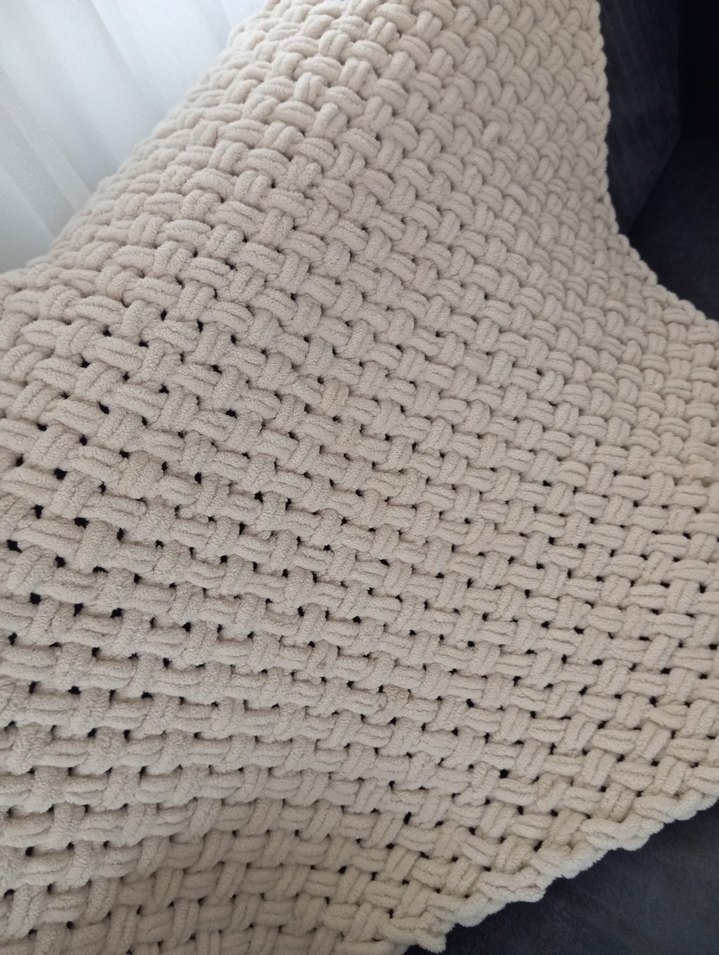 Yumuşak dokulu, desensiz bej renkli örgü çocuk battaniyesi, rahatlık sağlar.