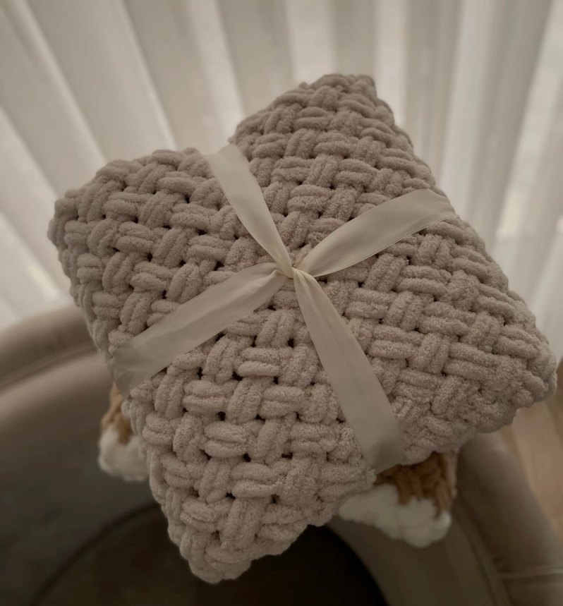 Bej renkli, yumuşak ve kalın dokulu örgü çocuk battaniyesi, sade ve desensiz tasarıma sahiptir.