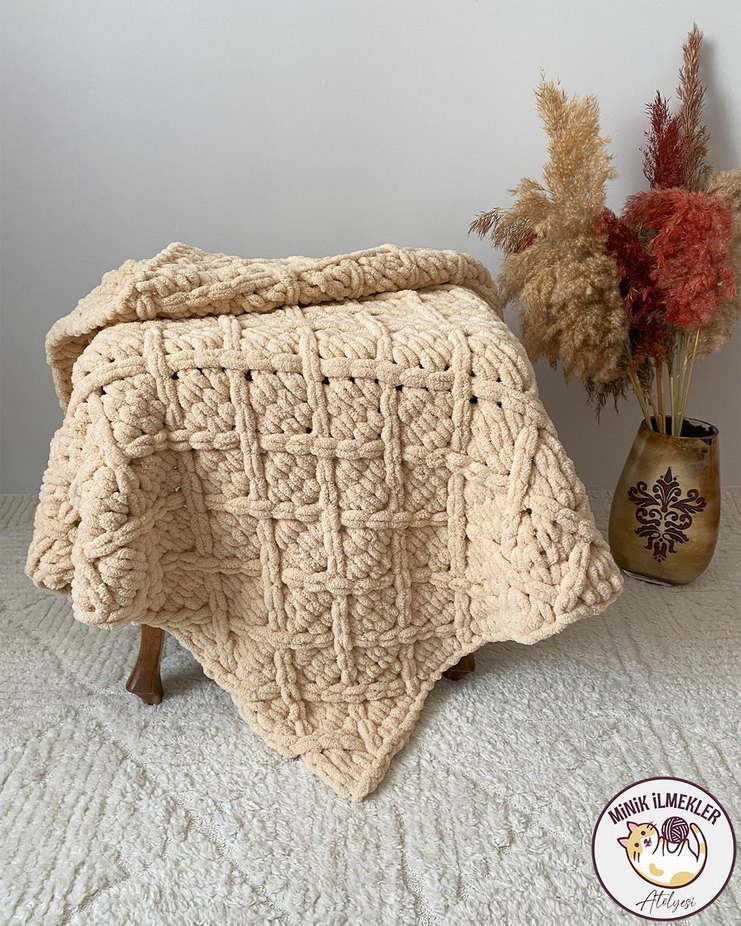 Minik ilmekler markalı, Yumuşak dokulu, örgü bej çocuk battaniyesi, sıcaklık ve konfor sağlar.