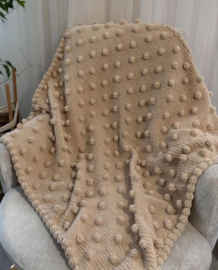 Bej renkte, yumuşak örgü kumaştan yapılmış çocuk battaniyesi, kabartmalı nokta dokusu ile ekstra konfor sağlar.