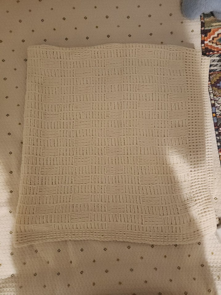 Hafif bej renkli, örgü dokulu çocuk battaniyesi, yumuşak ve rahat kullanıma uygundur.
