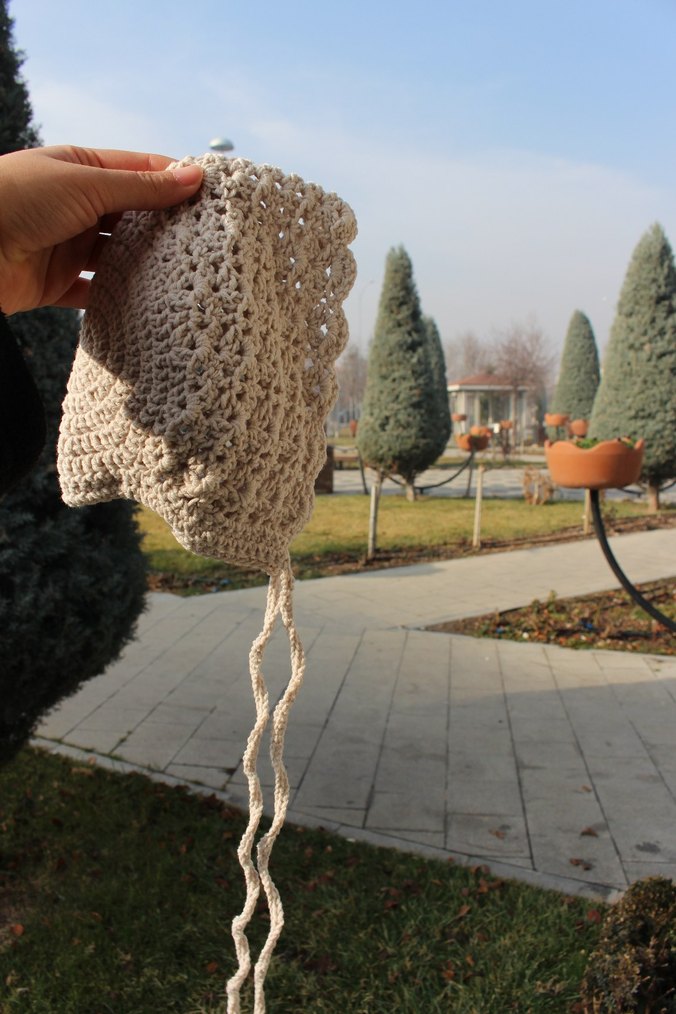 Bağcıklı, bohem tarzda, hafif bej renkli örgü çocuk bere. Rahat ve şık bir görünüm sağlar.