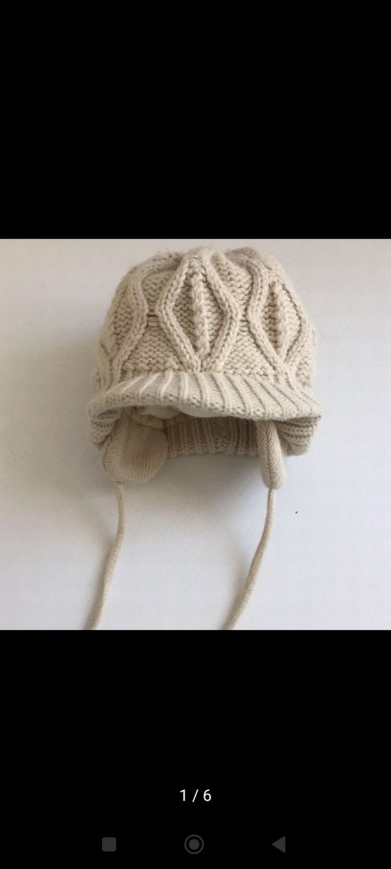 Bej renkli, kulaklıklı ve bağcıklı örgü çocuk bere, yumuşak trikodan yapılmıştır, sade bohem tarzda.
