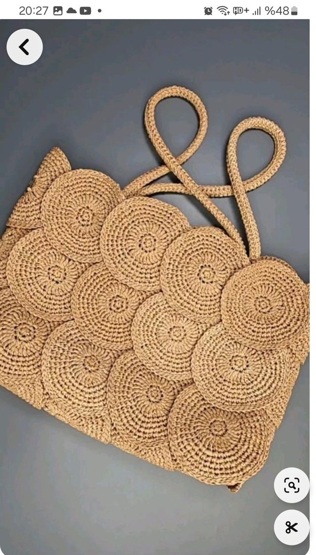 Bej renkli, dairesel işleme desenleri ve dantel detaylarıyla bohem tarzı örgü kadın çanta. Hafif ve günlük kullanıma uygun.