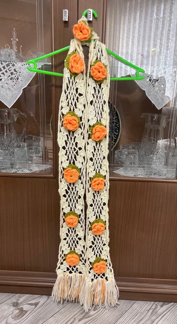 Renkli bej örgü dantel detaylı, turuncu çiçek süslemeli bohem tarz kadın şalı. Yumuşak ve dekoratif, retro görünüme uygun.