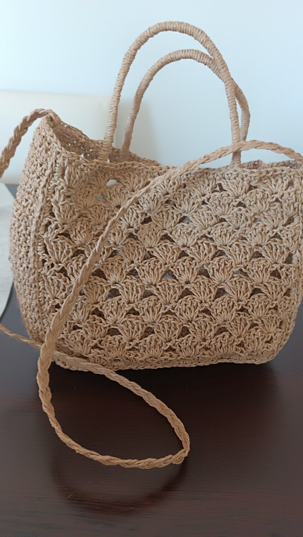 Bej renkli, dantel detaylı örgü kumaştan yapılmış bohem tarzda kadın çantası. Hafif renkli ve desensiz, günlük kullanıma uygundur.