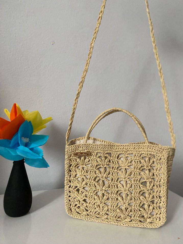 Bej renkte, çiçek desenli dantel detaylı örgü çanta, uzun askısı ile günlük kullanıma uygun el örgüsü bohem tarzda.