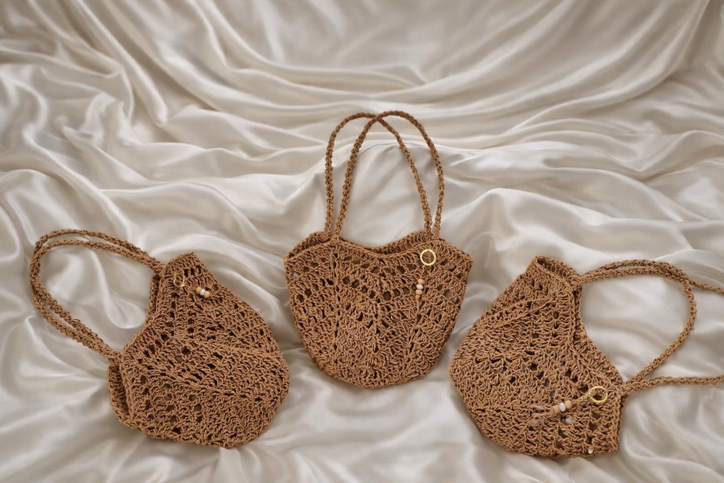 Bej renkli, dantel detaylı örgü kadın çantası. Bohem tarzda, hafif ve minimalist tasarıma sahip, günlük kullanıma uygun.