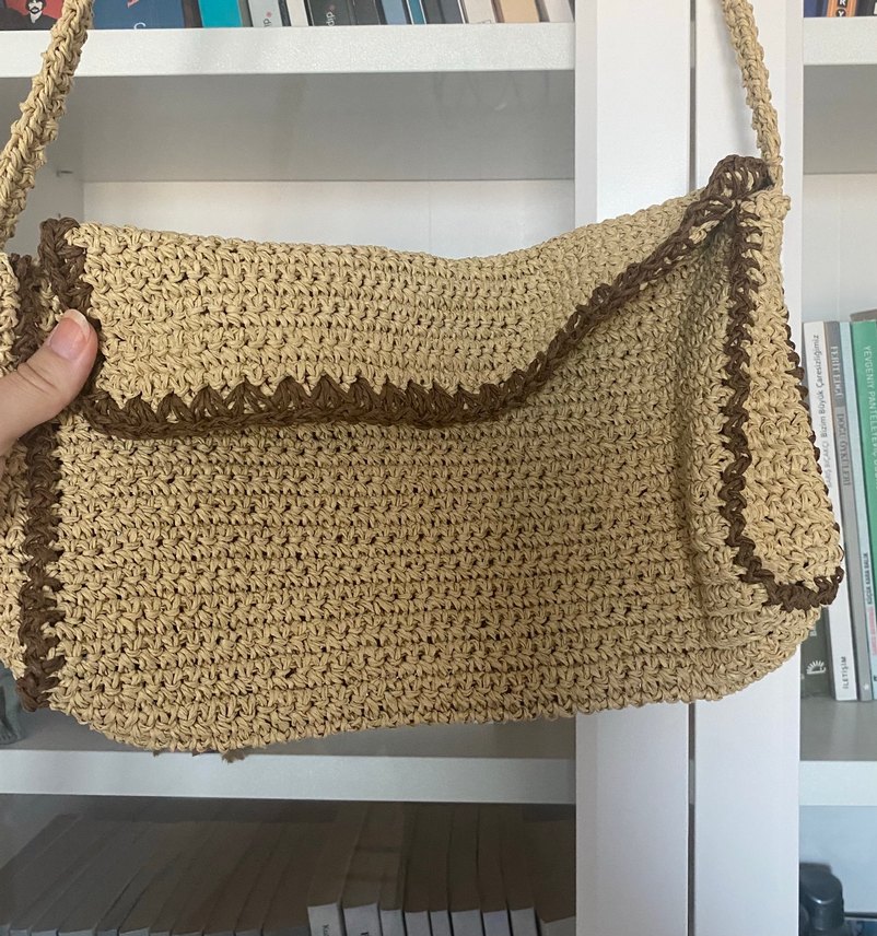 Bej renkli, dantel detaylı örgü kadın çantası. Bohem tarzda, minimal ve gündelik kullanıma uygun, desensiz hafif tasarım.