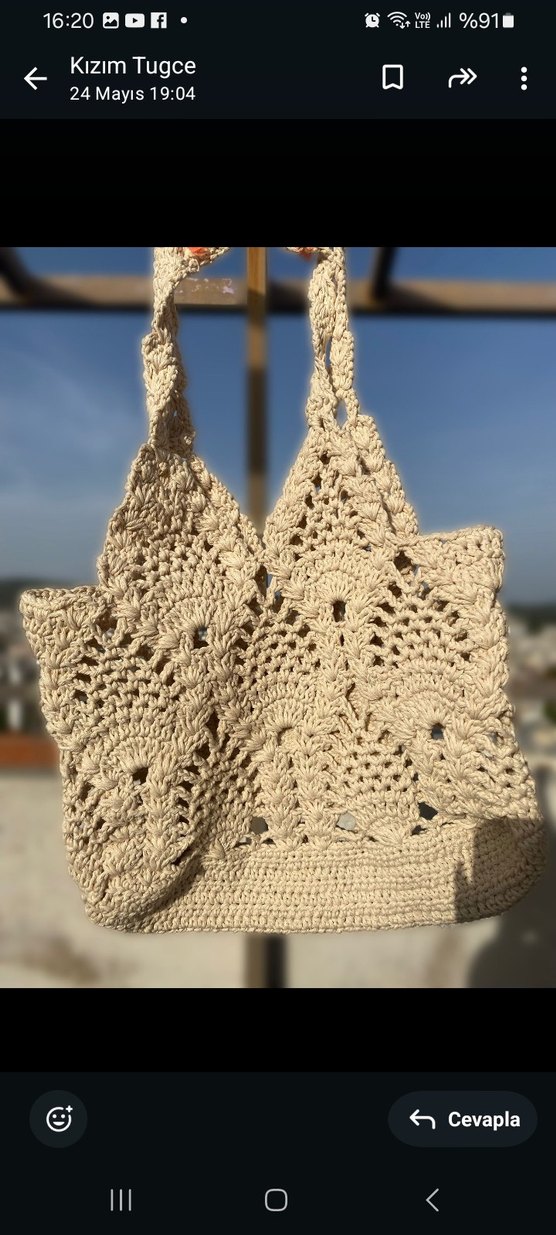 Bej renkli, dantel detaylı örme kadın çantası. Bohem tarzı için uygun, günlük kullanıma hafif ve desensiz tasarım.