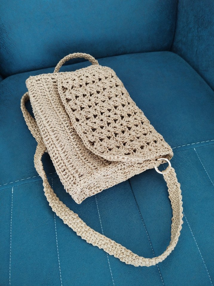 Bej renkli, örgü ve dantel detaylı kadın çantası, omuz askılı ve minimalist bohem tarz için uygun.