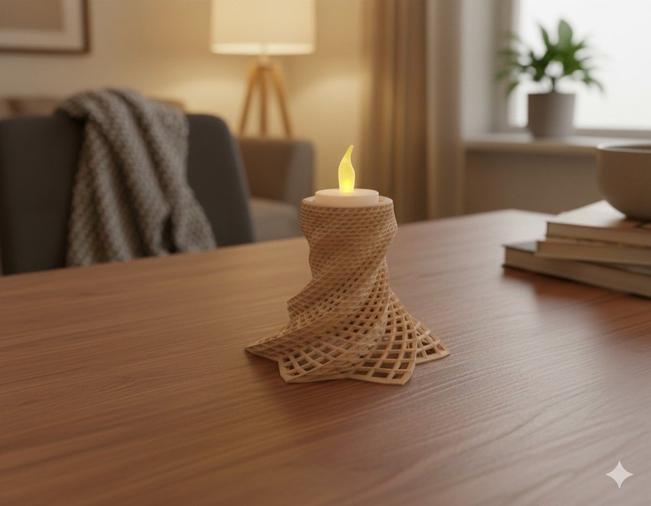 Bej renkte, örgü desenli ve gerçekçi alev efektli dekoratif mum, ortama sıcaklık katar. ️